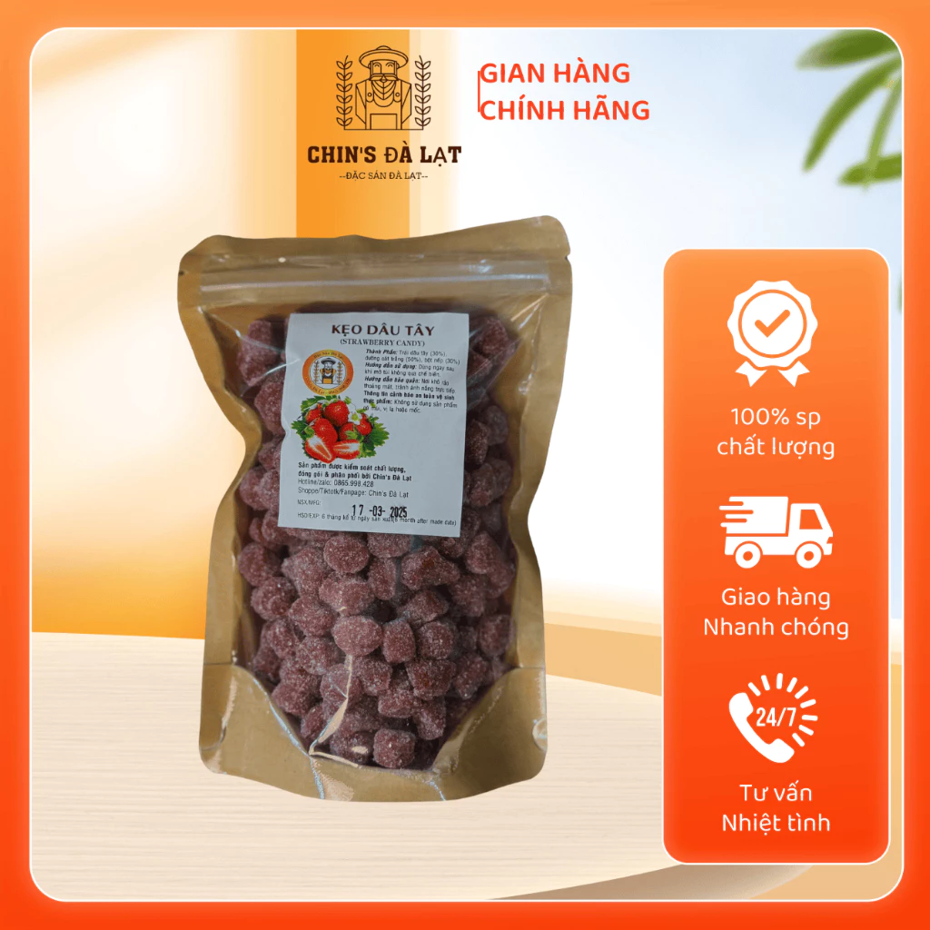 KẸO HƯƠNG DÂU TÂY ĐÀ LẠT – ĐẶC SẢN Chin’s ĐÀ LẠT là một sản phẩm đặc sản của vùng đất Đà Lạt, được sản xuất từ nguyên liệu dâu tây tươi ngon và các thành phần tự nhiên khác. Sản phẩm có giá gốc là 31500 VND, nhưng hiện đang được giảm giá còn 25000 VND.